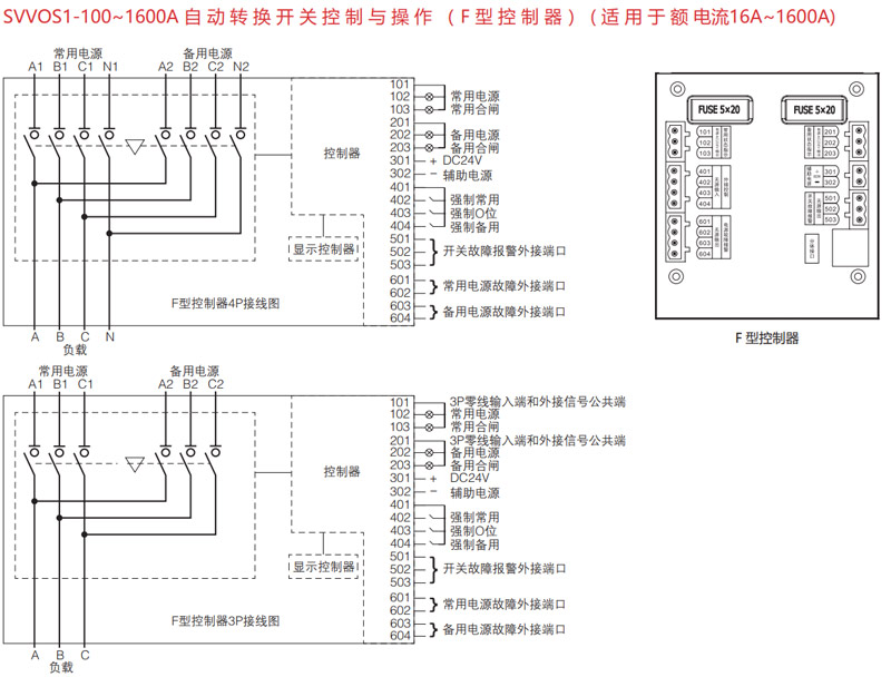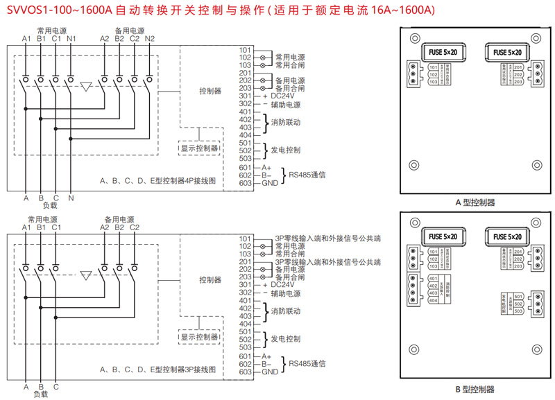 403、404- 內(nèi)部為一組常開繼電器干節(jié)點,用于消防動作返回信號之用;端子在正常的時候為常開,當(dāng)有消防信號送入控制器且開關(guān)轉(zhuǎn)換到分閘位置時 403 和 404 接通。(注:當(dāng)消防聯(lián)動功能啟動后自動轉(zhuǎn)換開關(guān)將停止工作,若要使開關(guān)在正常轉(zhuǎn)換,必須先撤除消防信號,再將控制面板上的自動手動控制開關(guān)轉(zhuǎn)換一次后開關(guān)即可恢復(fù)正常轉(zhuǎn)換。)