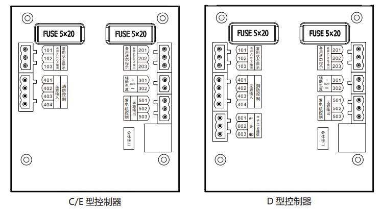 201 ~ 203: 備用電源外接狀態(tài)指示信號輸出 ( 有源 AC220V/0.5A)