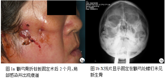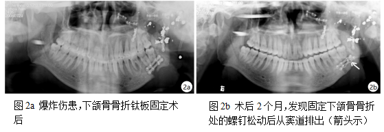 口腔頜面外傷近幾年呈逐漸上升趨勢(shì),在頜面外傷中除可能發(fā)生骨折、骨質(zhì)裸露或缺損外,其周?chē)浗M織也會(huì)有不同程度的水腫和損傷。尤其是爆炸傷患者,其軟組織創(chuàng)緣常有燒灼及震蕩傷,易發(fā)生局部軟組織的壞死[6]。在本組20例頜骨骨折患者中,多為粉碎性骨折,骨段的復(fù)位和固定有一定困難,且往往需要兩塊以上的鈦板固定在很狹窄的骨段上,以維持其穩(wěn)定性。加之相應(yīng)部位的軟組織有不同程度的壞死和損傷,血供較差,這些患者多在骨折復(fù)位固定術(shù)1~2個(gè)月發(fā)生局部疼痛,粘膜或皮膚出現(xiàn)瘺道,且時(shí)常有分泌物流出(圖1)。沿竇道可探到鈦板或螺釘,本組患者中5例訴有松動(dòng)螺釘從瘺道排出(圖2 )。這可能與鈦板固定區(qū)骨質(zhì)不健康導(dǎo)致局部感染,發(fā)生排斥反應(yīng),或與螺釘所在區(qū)域骨皮質(zhì)較少,螺釘固定不牢有關(guān)。當(dāng)皮膚或粘膜紅腫并有瘺道?,甚至有螺釘從竇道排出,此時(shí)局部換藥或使用抗生素雖可減輕患者疼痛和不適感,但不能解決根本問(wèn)題。應(yīng)在病情穩(wěn)定時(shí)及時(shí)取出鈦板,并對(duì)感染的軟硬組織進(jìn)行處理。