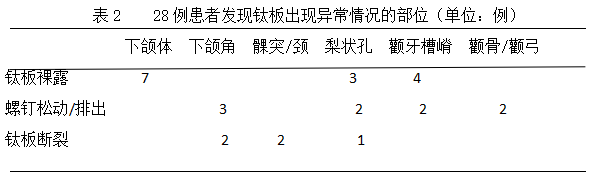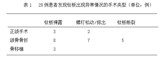 方法:對(duì)28例鈦板裸露、螺釘松動(dòng)或脫落及鈦板斷裂患者的手術(shù)類(lèi)型、手術(shù)時(shí)的情況,鈦板出現(xiàn)異常情況的時(shí)間等進(jìn)行了回顧性分析與研究。