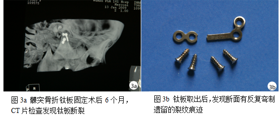 由于頜骨的特殊結(jié)構(gòu),加之頜面外傷和正頜術(shù)后頜骨的移動(dòng),在進(jìn)行骨段固定時(shí),使用的鈦板常需塑型,以便被動(dòng)貼合于骨面上[3]。?在操作過(guò)程中若對(duì)上下頜骨形態(tài)和弧度不甚了解而反復(fù)彎制鈦板,容易造成鈦板微裂或金屬疲勞?,加之這些鈦板常固定于應(yīng)力集中區(qū),隨著頻繁的張閉口運(yùn)動(dòng)及頜骨受力,容易發(fā)生鈦板斷裂,本組鈦板斷裂的患者中有4例是這種情況(圖3)。另外,在許多口腔頜面外科手術(shù)中,需通過(guò)口內(nèi)途徑固定鈦板,手術(shù)視野暴露有時(shí)不充分,器械不能在正常角度下使用,尤其時(shí)在鉆孔時(shí),鉆頭反復(fù)摩擦鈦板孔邊緣,使其變薄、變窄,鈦板的強(qiáng)度明顯減弱,也是手術(shù)后造成鈦板斷裂的原因之一,本組鈦板斷裂的患者中有1例屬這種情況。鈦板斷裂后,患者僅有局部不適感,均在術(shù)后復(fù)診拍攝X線(xiàn)片時(shí)發(fā)現(xiàn)。發(fā)現(xiàn)鈦板斷裂后,應(yīng)囑患者減少?gòu)堥]口運(yùn)動(dòng),以防鐵板斷段刺傷周?chē)M織,并應(yīng)盡早取出鐵板。